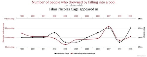 For the 11-year period from 1999 through to 2009, there is an uncanny correlation between the number of people who drowned falling in a pool, and the number of films Nicolas Cage appeared in. The patterns match. But is there causation? Did those 120 people drown in 2009 because Nicolas Cage made those movies? Did Nicolas Cage make those movies because that record number of people died?