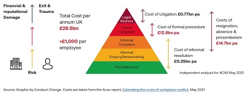 There are both moral and competitive drivers to adopting such an approach, as we know that there is both a human and a business cost to workplace bullying, with an increase in risk to both parties as events escalate. In 2021, according to Acas, the estimated annual cost of conflict to the UK economy was £28.5 billion, or just over £1,000 per employee. The majority of these costs are associated with the costs of resignation, absence and presenteeism aligned with the use of formal procedures, reinforcing that there is a critical time to intervene – namely before formal processes are reached or have begun.