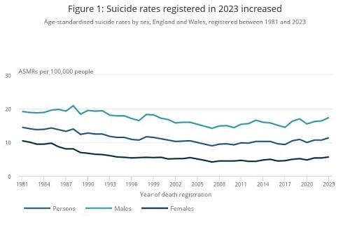 The ONS figures showed that the highest suicide rates in England and Wales were among men, where the rate was 17.4 deaths per 100,000 people in 2023 – up from 16.4 deaths per 100,000 in 2022. The rate rose to 25.5 deaths per 100,000 for males aged between 45 and 49.