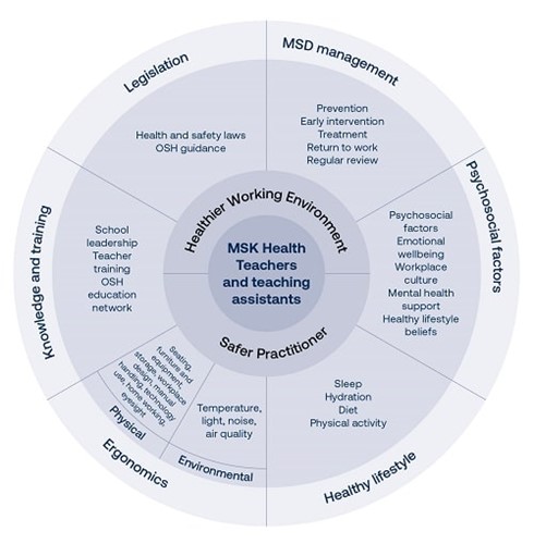 In essence, this means identifying the MSD hazards and risks teachers may be exposed to, developing a culture of MSD prevention in schools and educating teaching staff about how to reduce MSD risks to themselves and maintain good musculoskeletal health more widely.