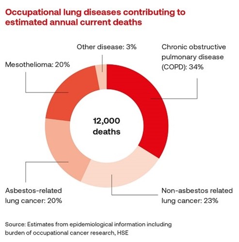 Some might say, “but this is all Grandad’s disease” – i.e. due to past asbestos exposures. In one sense I wish it were and then we could consign it to the past given the ban on asbestos use. Unfortunately, that’s not true. According to HSE, 40 per cent of those 12,000 respiratory fatalities are asbestos-related. The other 60 per cent are due to COPD (chronic obstructive pulmonary disease) and other cancers. That’s still a huge number.