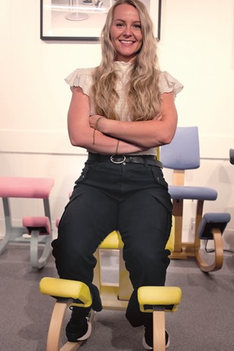 Sianna Lunn on a kneeling chair, one of many active chairs stocked at Back in Action. Photograph: Matthew Holder