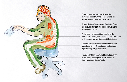 An illustration showing the damage that poor posture and prolonged sitting can do to the body. Illustration: Matthew Holder