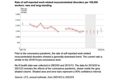 Prior to the coronavirus pandemic, the rate of self-reported work-related musculoskeletal disorders showed a generally downward trend. The current rate is similar to the 2018/19 pre-coronavirus level.