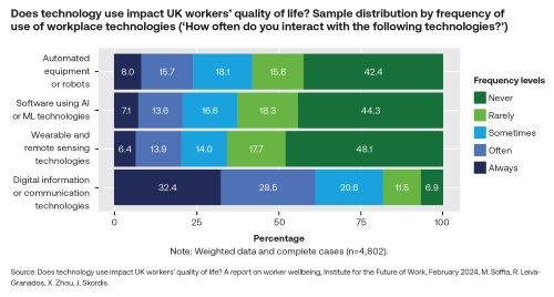 These findings echo those of a 2024 report: Does Technology Use impact UK Workers’ Quality of Life? A report on worker wellbeing, which notes negative impacts such as fears over job security, feelings of purposelessness and a range of ill-health conditions including anxiety, depression and burnout. A 2024 survey of US and UK workers found that 59 per cent of respondents identified digital distraction as a contributory factor in workplace stress, rising to 71 per cent among managers.