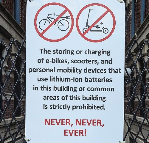 A sign in an apartment in Brooklyn, New York stresses safe charging of occupants' e-bikes and other vehicles. Photograph: iStock