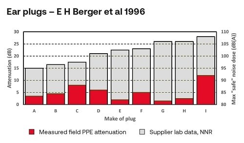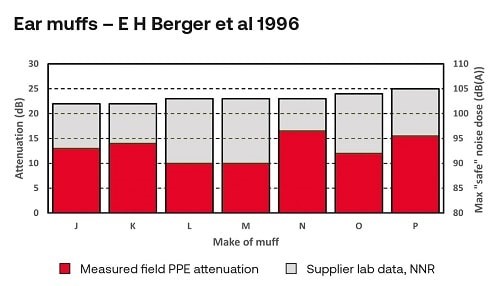This means the PPE provides adequate protection for noise levels only up to 83dB(A) – 90dB(A). In short, the PPE provides between 3dB and 10dB attenuation, depending on the individual user. Hence one user will be safe up to 90dB(A) and another only up to 83dB(A) – if the in-ear level is to be kept to 80dB(A) or less.