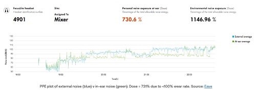 The figure below shows the data collected by an example of this new generation of PPE, the FocusLite headsets from Eave, over a shift. The PPE plots the external and ‘at the ear’ noise levels inside the earmuffs of the user and calculates the noise dose. This provides automated verification of the degree of protection provided. See: www.eave.io/product