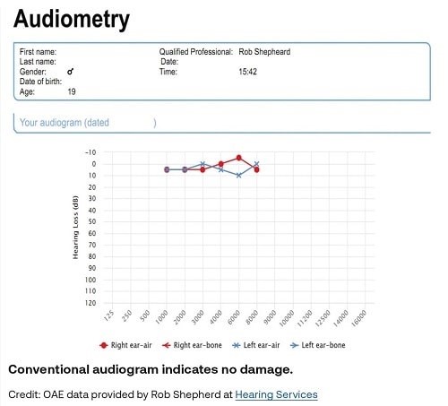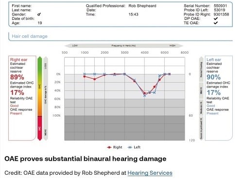 The OAE hearing tests that are now available can detect early damage – as shown in the figures in the ‘Audiometry’ and ‘OAE’ diagrams above (OAE data kindly provided by Rob Shepherd at Hearing Services).