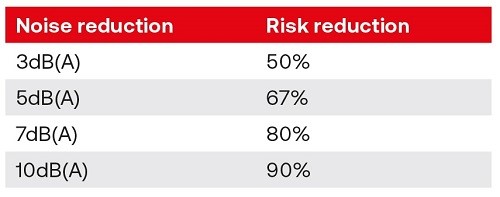 Hence, cutting noise from 97dB(A) to 90dB(A), for example, reduces the risk to employee hearing health by 80 per cent. The wearing of personal hearing protection by employees will still be required by law, but the risk from noise is 80 per cent lower and it is very much easier to achieve adequate protection from the PPE when noise levels are reduced to (or even below) 90dB(A).