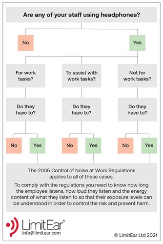 The flowchart on this page can help you decide how to take action to control the risk of hearing damage from workers using headphones, both for work tasks and personal reasons. It’s available at: bit.ly/3ky9rY4