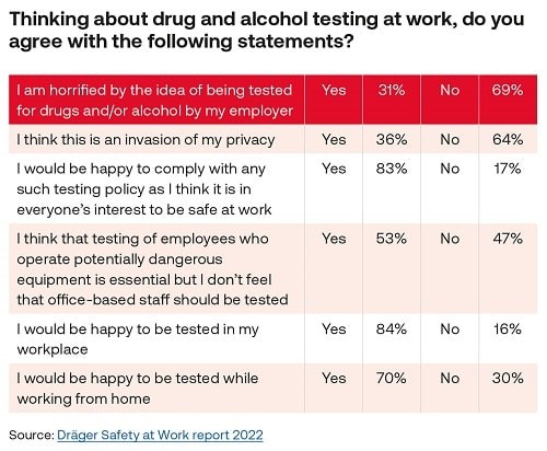 However, employers can take heart that employees have a growing recognition of the role that everyone within a business must play in keeping colleagues safe. Independent research carried out earlier in the year for the 2022 Dräger Safety at Work report showed that there is growing recognition by employees of the important role of drug and alcohol testing in workplace safety.