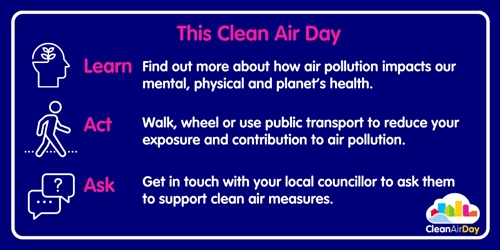- Act: walk, wheel or use public transport to reduce your exposure and contribution to air pollution. If you drive, try leaving the car behind on Clean Air Day and one day every week