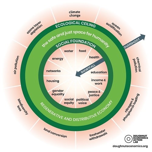 It reimagines traditional economic thinking by moving away from endless growth and focusing instead on creating a safe and just space for humanity – between the social foundation and ecological ceiling. Falling below the social foundation means people are living in deprivation, while going beyond the ecological ceiling of planetary boundaries like climate change, biodiversity loss and pollution leads to environmental degradation, and ultimately the planet not being able to support human life.